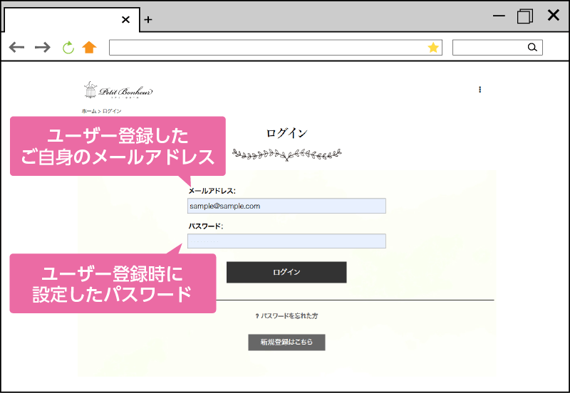 プティ・ボヌール本店サイト内(https://petit-bon.ocnk.net/)から学校専用ページにログイン